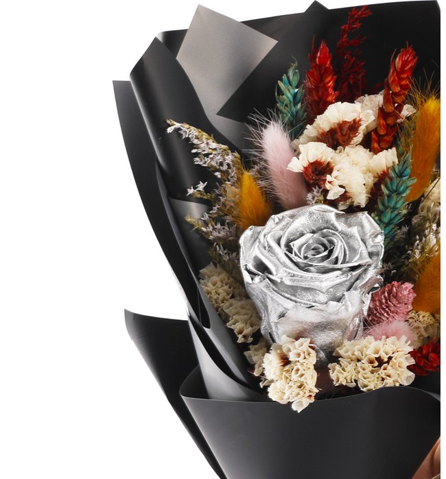 Kuru bitkiler ve solmayan özel renk gül ile tasarladığımız ''Mini Solmayan Gül buketi ile O'na yıllarca saklayabileceği bir hediye sunabilirsiniz. Tasarımda kullanılan malzemeler; 1 adet XL solmayan gül, kurutulmuş tatarika, chipso, renkli başak, ithal kuru bitkiler... Bakımı hakkında: Gerçek ekvator güllerinden elde edilen ''Solmayan Gül" herhangi bir bakıma ihtiyaç duymadan su, güneş ve direkt temastan uzak tutulduğu sürece yaklaşık 2 yıl canlılığını korumaktadır.