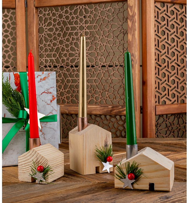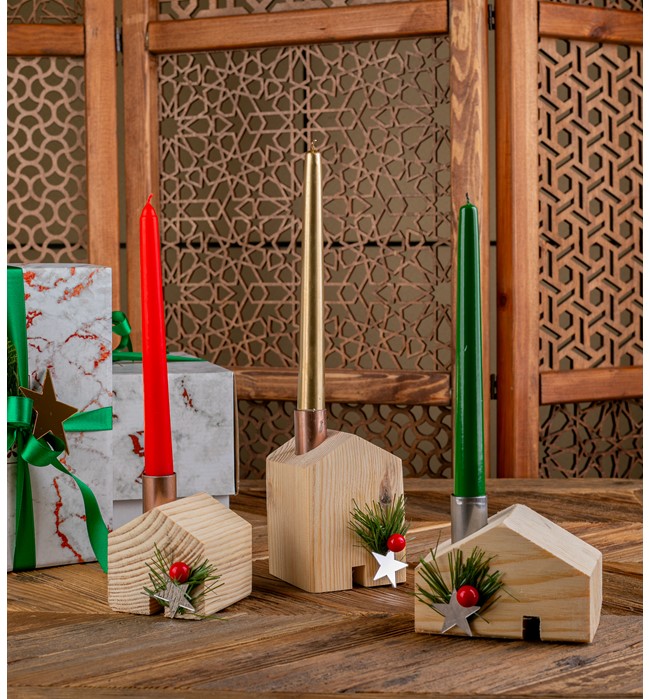 3'lü Şamdanlı Natural Dekoratif Ev Figürü