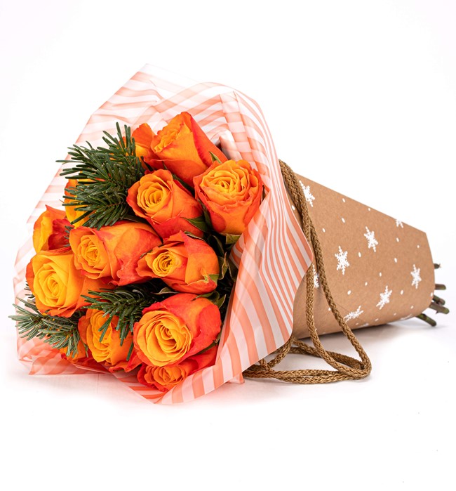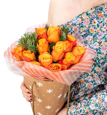 Tasarım çantasında 15 adet turuncu gül içerir.