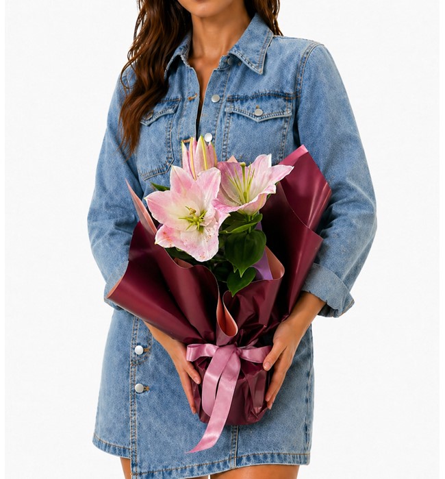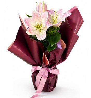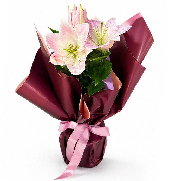 Yaklaşık 35-45 cm saksı bitkisi pembe lilyum bordo tonlarında ambalaj kağıdına sarılmıştır.