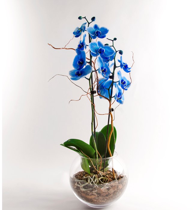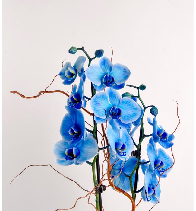 Orkide bakım kartı ile birlikte gönderilir. Ölçüleri: Saksı çapı: 19 cm Saksı Yüksekliği: 19 cm Yaklaşık toplam yükseklik: 70 cm Paşabahçe cam saksı içerisinde özel orkide toprağı ile birlikte 2 dal mavi orkide kullandık. Bu çok özel orkidenin zarifliğini salix dalları ile ortaya çıkardık. NOT: Doğada bu renk orkide bulunmamaktadır. Özel bir yöntem ile çiçekler boyanmıştır. Çiçekler belli bir süre sonra beyaz renge dönüşecektir.