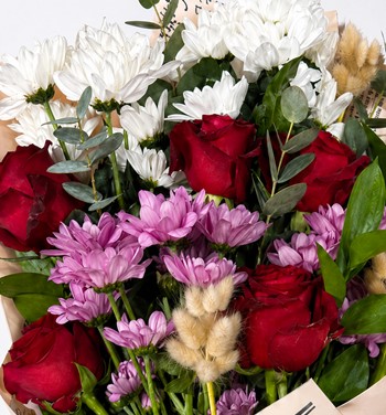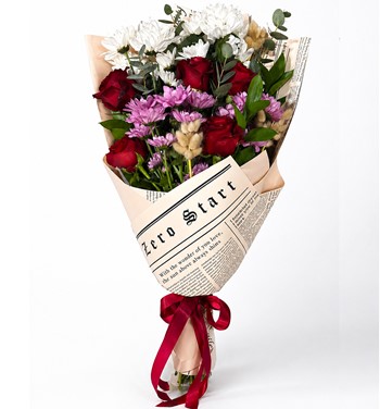 Gazete Bukette Kırmızı Gül ve Pembe-Beyaz Krizantem