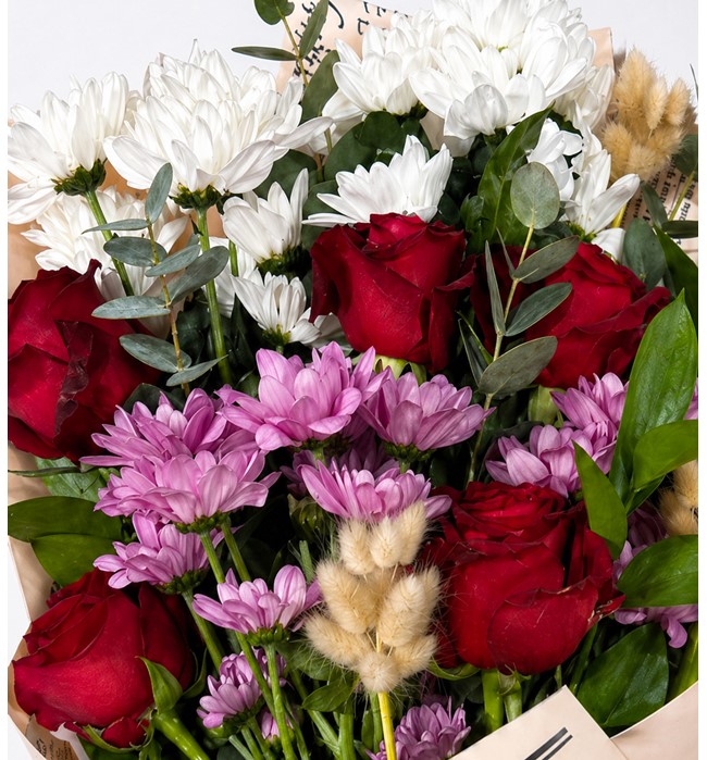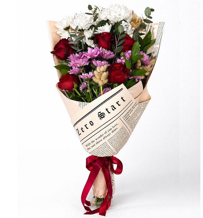 Yaklaşık 35-40 cm buket, kırmızı gül , beyaz krizantem , pembe krizantem ve yeşillikler ile hazırlanıp, gazete buket ambalaj kağıdına sarılmıştır.