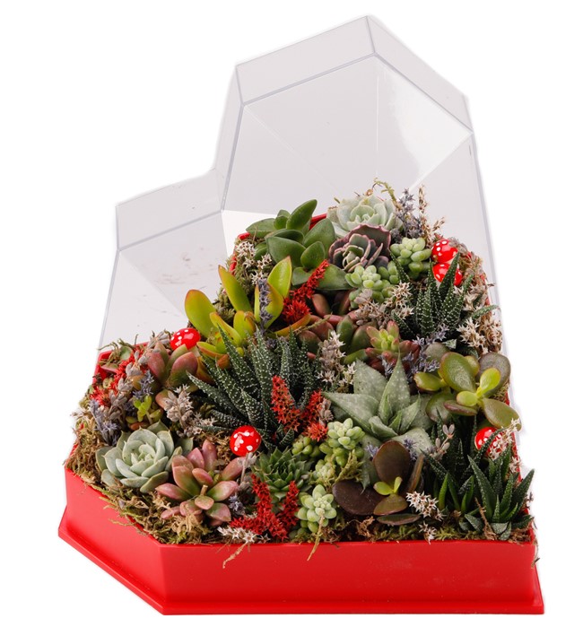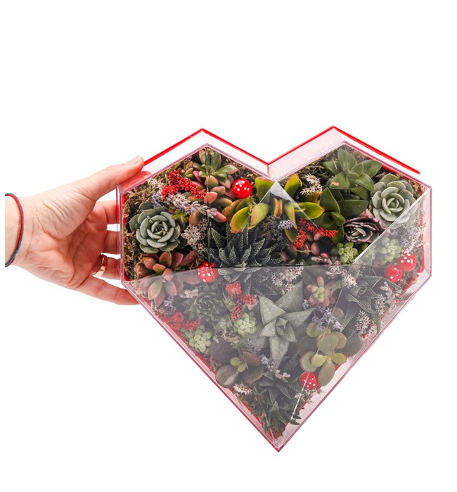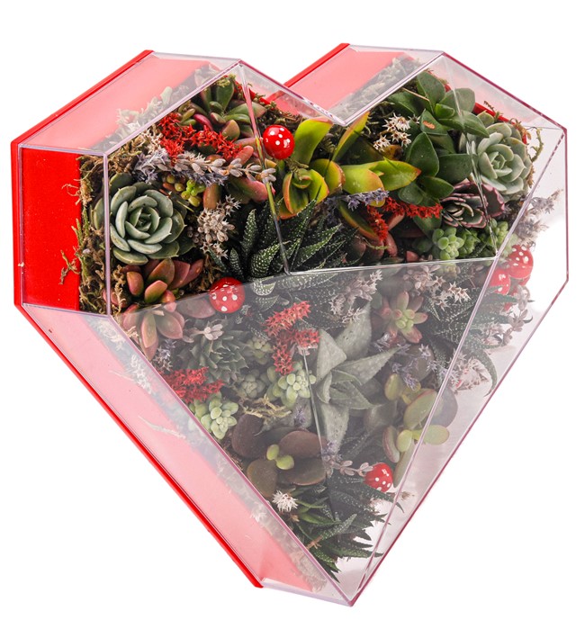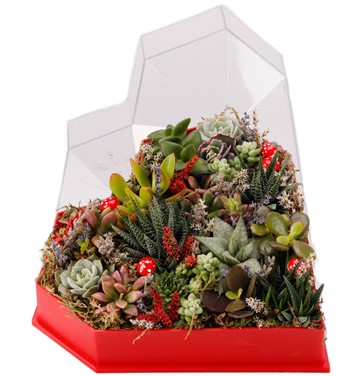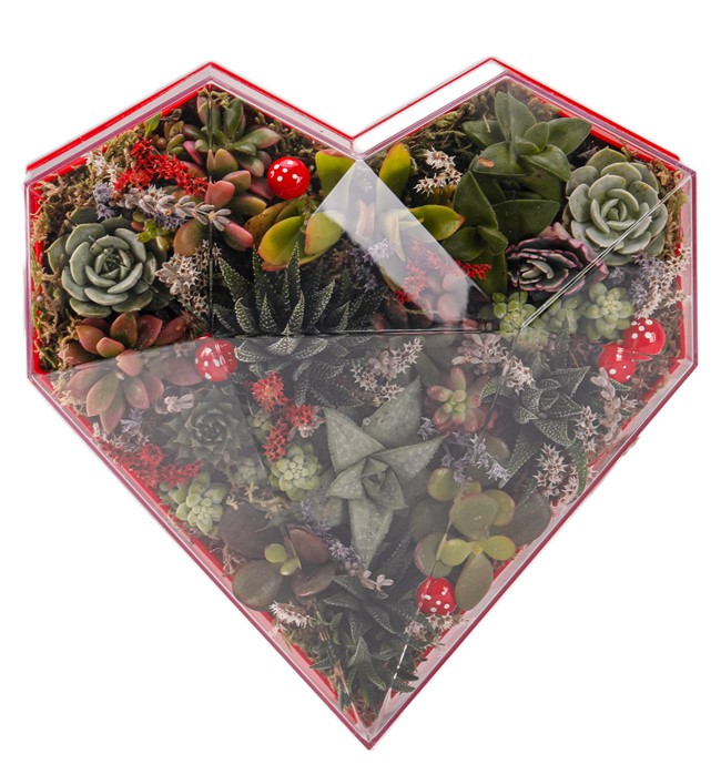 Göz alıcı renklerle tasarlanan bu tasarımı sevgilinize hediye edebilir, yıllarca kendinizden bir hatıra bırakabilirsiniz. Klasik kalp formda pleksi kutu içerisinde mix sukulent ve kurutulmuş bitki vardır. Haftada bir az miktarda sulanarak uzun yıllar aynı formu korur.