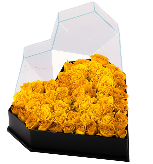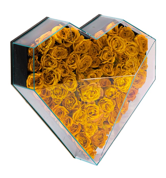 Pleksi Kapaklı Geometrik formlu kalp kutu içerisinde sarı mini gül tasarımıdır.