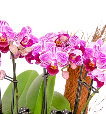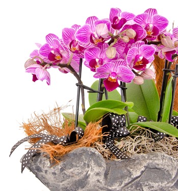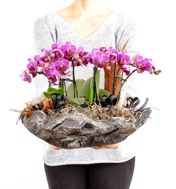 Ölçüleri: Yaklaşık toplam yükseklik: 22 cm Saksı yüksekliği: 8 cm Saksının genişliği: 30 cm Bakımı Hakkında: Orkideler köklerinde su depolayan bitkilerdir. Bu yüzden haftada iki kez püskürtme yöntemiyle su verilmesi ya da köklerinin suyun altında tutulması kafidir. Ayrıca orkideler ışığı ve gece esintisini sever. Yaz aylarında özellikle geceleri açık bir pencere önünde tutulması çiçeklenme oranını arttırır. Çiçekleri tamamen döküldüğünde bir sonraki çiçeklenme dönemine kadar serin bir ortamda muhafaza edilmesi kafidir.