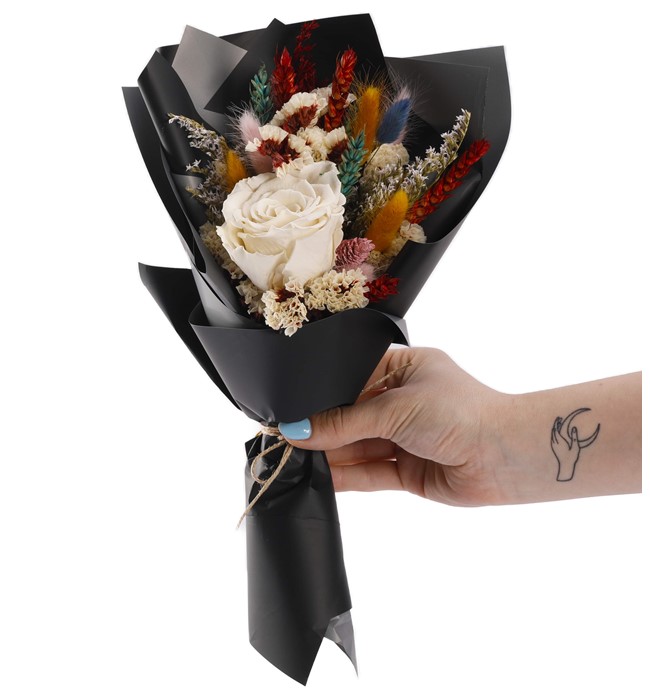 Kuru bitkiler ve solmayan özel renk gül ile tasarladığımız ''Mini Solmayan Gül buketi ile O'na yıllarca saklayabileceği bir hediye sunabilirsiniz. Tasarımda kullanılan malzemeler; 1 adet XL solmayan gül, kurutulmuş tatarika, chipso, renkli başak, ithal kuru bitkiler... Bakımı hakkında: Gerçek ekvator güllerinden elde edilen ''Solmayan Gül" herhangi bir bakıma ihtiyaç duymadan su, güneş ve direkt temastan uzak tutulduğu sürece yaklaşık 2 yıl canlılığını korumaktadır.