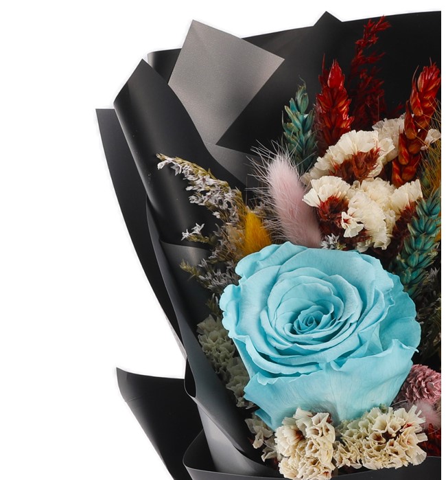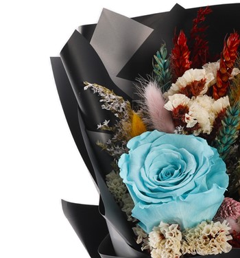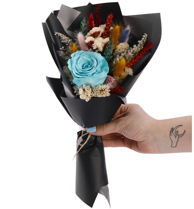 Kuru bitkiler ve solmayan özel renk gül ile tasarladığımız ''Mini Solmayan Gül buketi ile O'na yıllarca saklayabileceği bir hediye sunabilirsiniz. Tasarımda kullanılan malzemeler; 1 adet XL solmayan gül, kurutulmuş tatarika, chipso, renkli başak, ithal kuru bitkiler... Bakımı hakkında: Gerçek ekvator güllerinden elde edilen ''Solmayan Gül" herhangi bir bakıma ihtiyaç duymadan su, güneş ve direkt temastan uzak tutulduğu sürece yaklaşık 2 yıl canlılığını korumaktadır.
