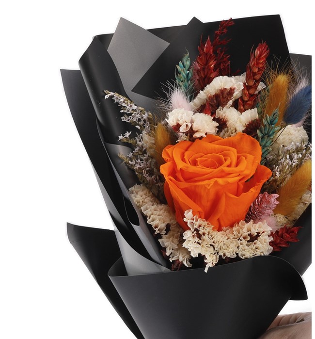 Kuru bitkiler ve solmayan özel renk gül ile tasarladığımız ''Mini Solmayan Gül buketi ile O'na yıllarca saklayabileceği bir hediye sunabilirsiniz. Tasarımda kullanılan malzemeler; 1 adet XL solmayan gül, kurutulmuş tatarika, chipso, renkli başak, ithal kuru bitkiler... Bakımı hakkında: Gerçek ekvator güllerinden elde edilen ''Solmayan Gül" herhangi bir bakıma ihtiyaç duymadan su, güneş ve direkt temastan uzak tutulduğu sürece yaklaşık 2 yıl canlılığını korumaktadır.