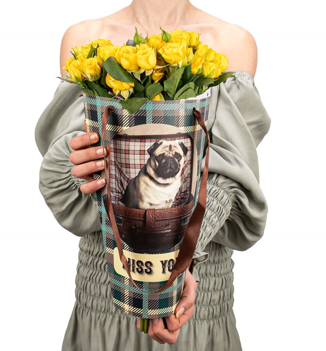 Özel taşıma çantasında sarı renk 10 dal mini güller kullanılarak tasarlanmıştır.