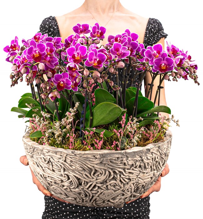 Noodle Serisi mini mor Orkide Tasarım içerisinde özel orkide toprağı ile birlikte mini mor orkideler kullandık. Orkideler köklerinde su depolayan bitkilerdir. Bu yüzden haftada iki kez püskürtme yöntemiyle su verilmesi ya da köklerinin suyun altında tutulması kafidir. Ayrıca orkideler ışığı ve gece esintisini sever. Yaz aylarında özellikle geceleri açık bir pencere önünde tutulması çiçeklenme oranını arttırır. Çiçekleri tamamen döküldüğünde bir sonraki çiçeklenme dönemine kadar serin bir ortamda muhafaza edilmesi kafidir.