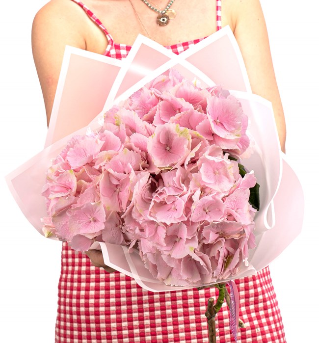 Tasarımda 3 dal iri kafa pembe ortanca kullanılmıştır.