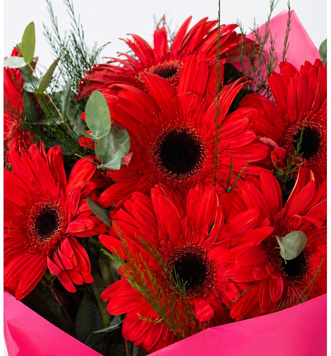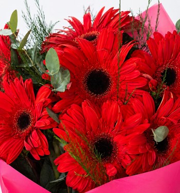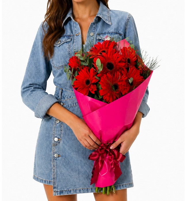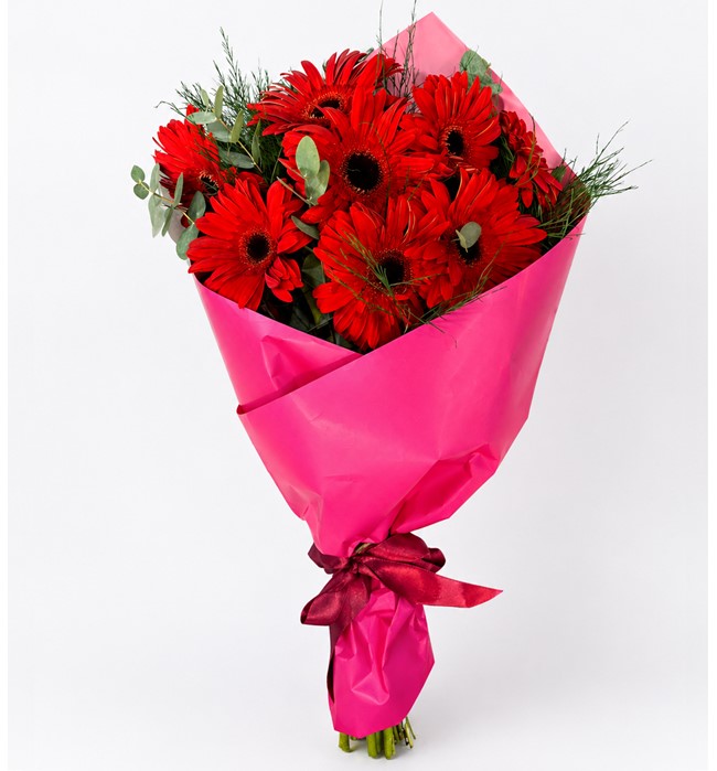 Yaklaşık 30-40 cm buket, kırmızı gerbera yeşillikler ile hazırlanıp, pembe tonlarında ambalaj kağıdına sarılmıştır.