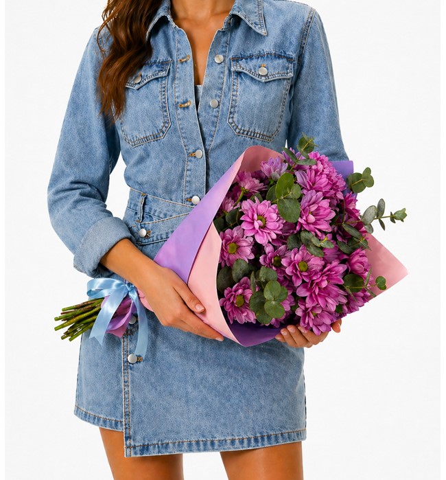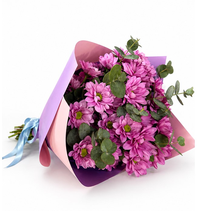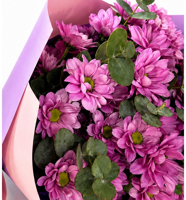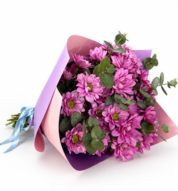 Yaklaşık 40-50 cm buket, pembe krizantem ve okaliptus ile hazırlanıp, pudra pembe-lila tonlarında ambalaj kağıdına sarılmıştır.