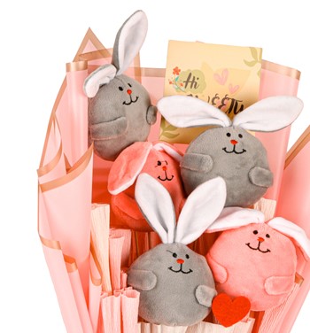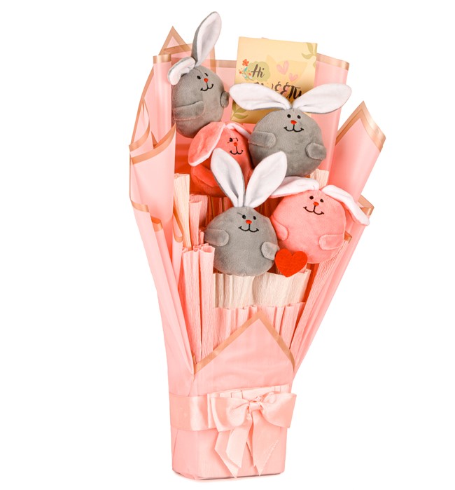 - Sevimli tasarımıyla dikkat çeken Pink Serisi, peluş tavşan figürleriyle süslenmiş buket, sevdiklerinize şirin bir hediye alternatifi sunar.
