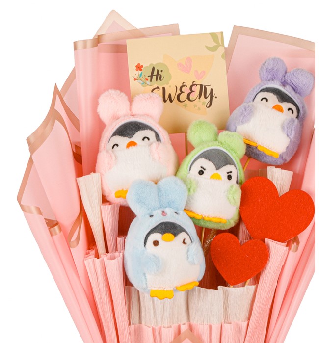 - Sevimli penguen figürleriyle süslenmiş buket, özel günlerinizde sevdiklerinize neşe katmak için idealdir.