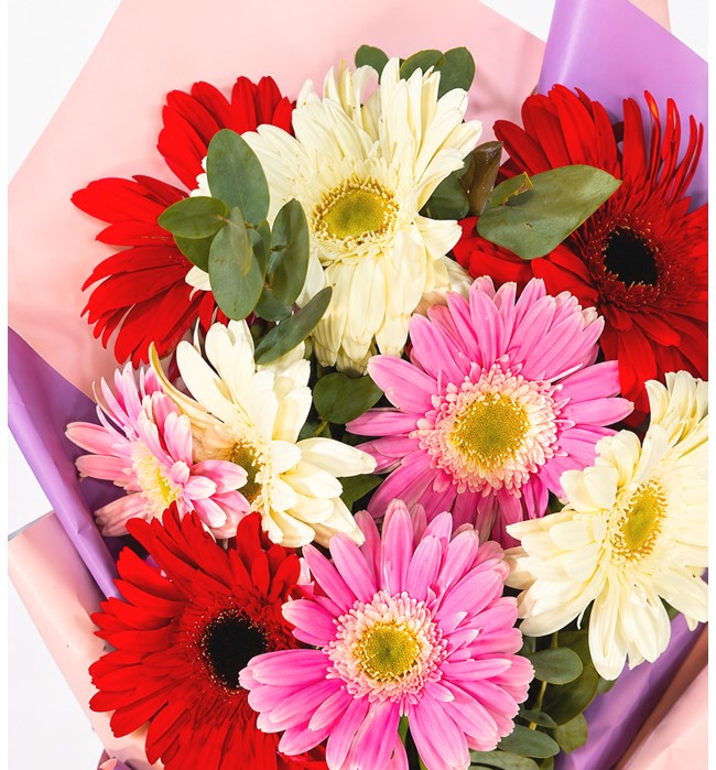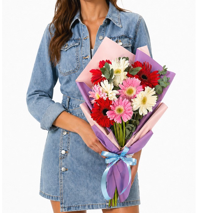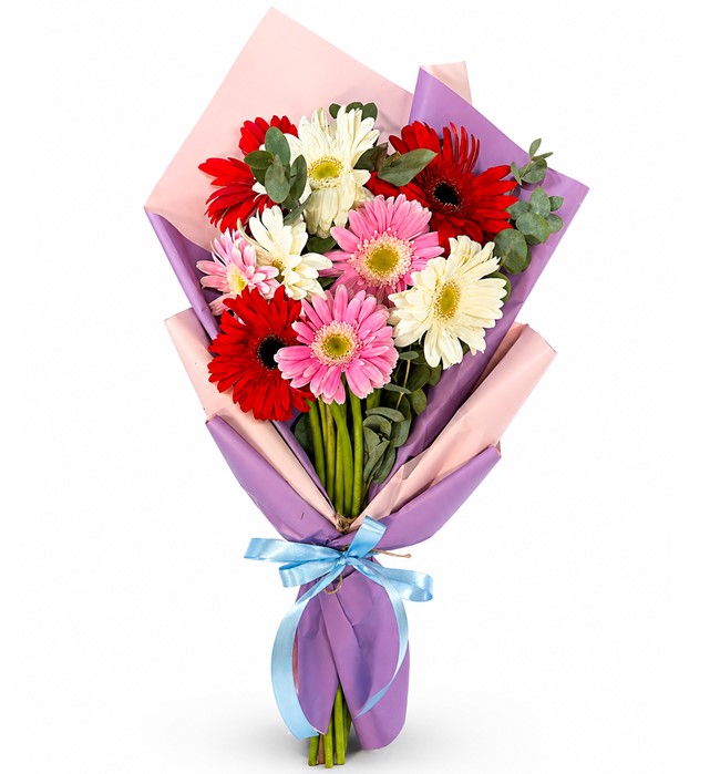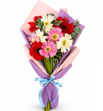 Yaklaşık 30-40 cm buket, kırmızı , beyaz , pembe gerbera ve yeşillikler ile hazırlanıp, pudra pembe-lila tonlarında ambalaj kağıdına sarılmıştır.