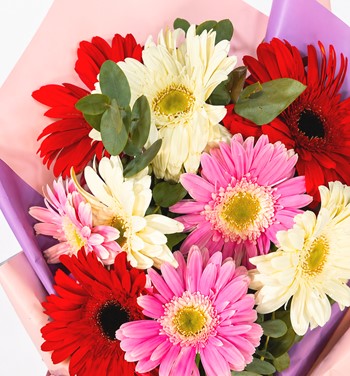 Pudra Pembe - Lila Bukette Kırmızı , Pembe ve Beyaz Gerberalar