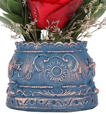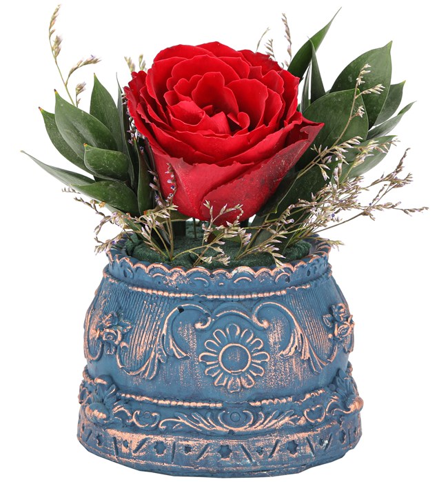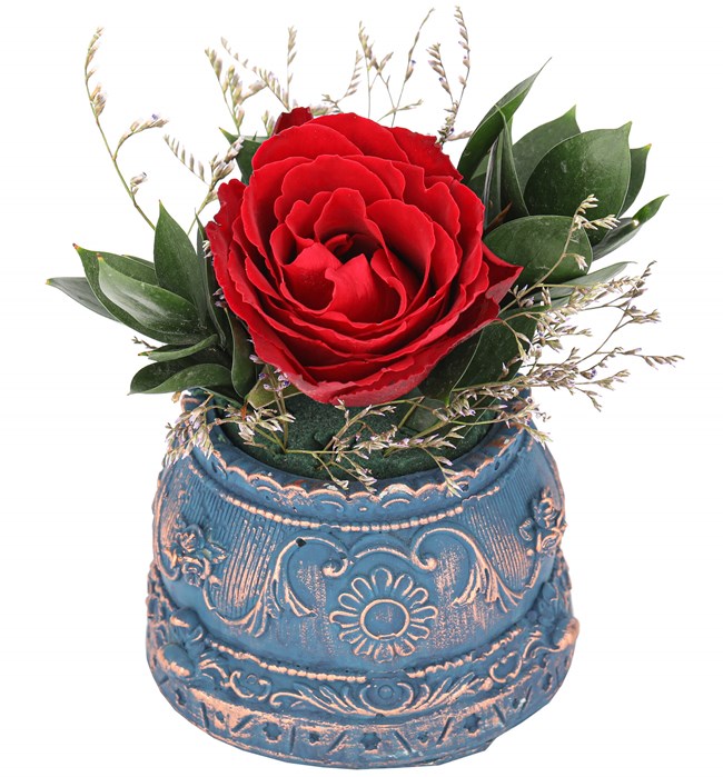 Yuvarlak formlu barok saksı içerisinde kırmızı gül tasarımıdır.