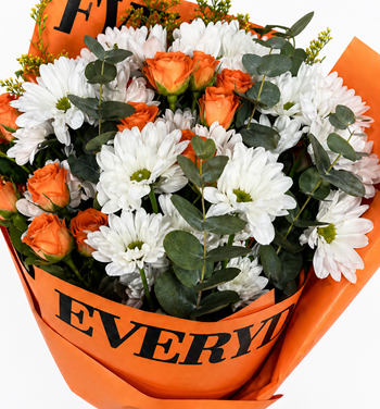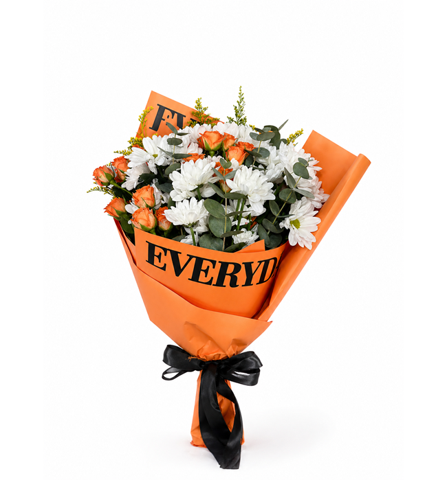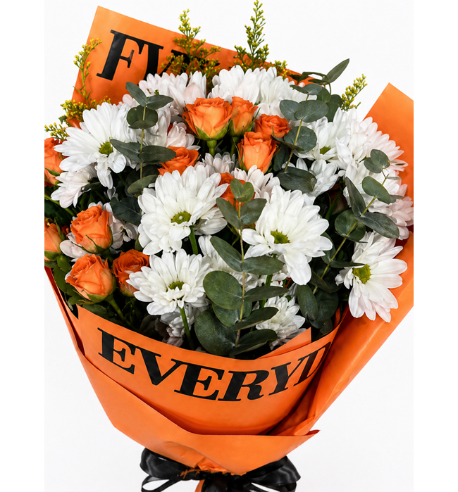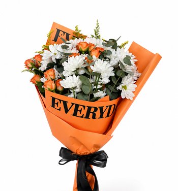 Yaklaşık 30-40 cm buket, turuncu mini gül , beyaz krizantem ve yeşillikler ile hazırlanıp, yazı baskılı turuncu tonlarında ambalaj kağıdına sarılmıştır.