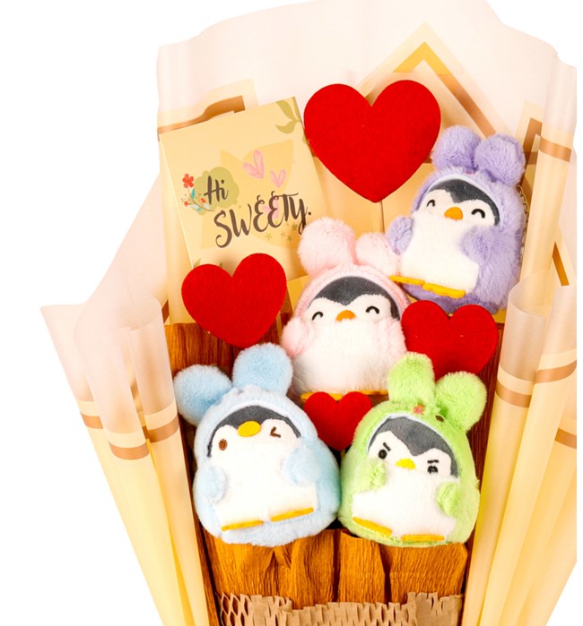 - Sevimli penguen figürleriyle süslenmiş buket, özel günlerinizde tercih edebileceğiniz sevimli ve şık bir hediyedir.